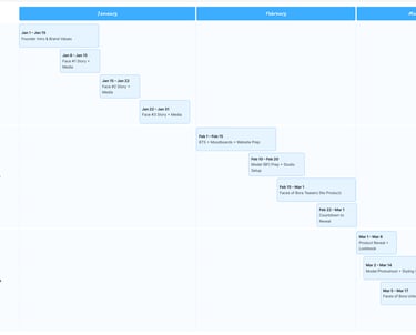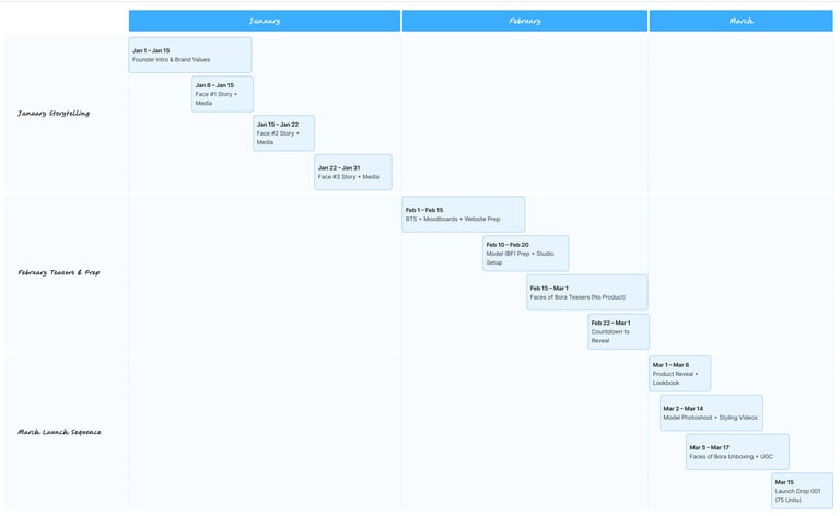 To bring Drop 001 to life, I developed a structured three-month launch timeline covering storytelling, teaser campaigns, content creation, creator submissions, production, unboxing, and the product reveal. This timeline integrates the Content Plan, Faces of Bóra submissions, and all brand touchpoints into one cohesive flow.